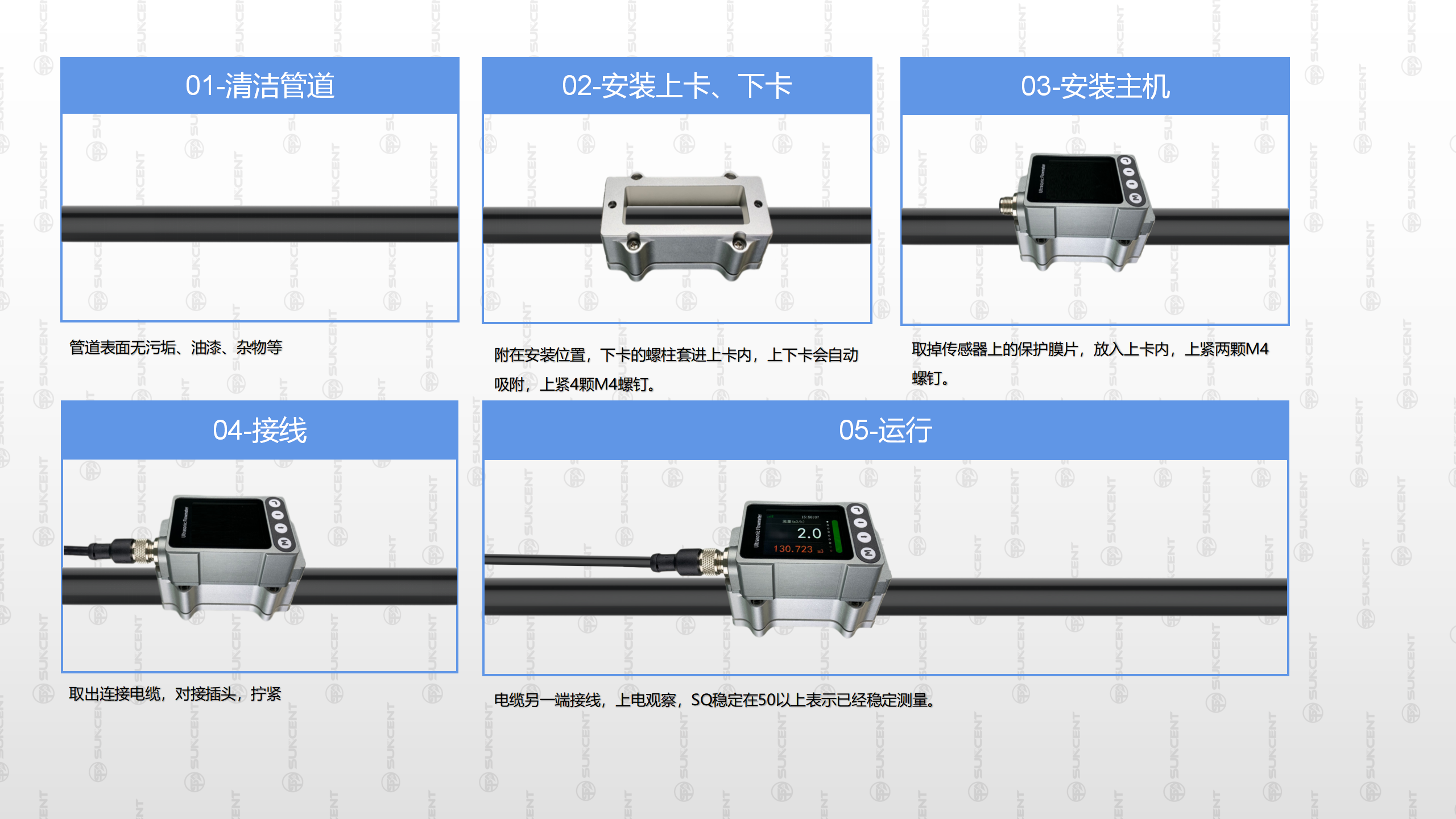 X5具有操作簡易、外觀精致的特點。首先,X5在結構設計上使用了圓形磁鋼,實現安裝時自動卡合,從安裝到測量,只需2-3分鐘即可完成。其次,X5應用目前世界先進的時間測量芯片,時間分辨率達到50ps,更是采用目前流行的IPS LCD顯示屏,在光線不足的環境下也能實現輕松讀數,同時還有全新的流量波形圖示。最后,選單結構簡單,操作者通過4個按鍵可輕松設置或修改參數。